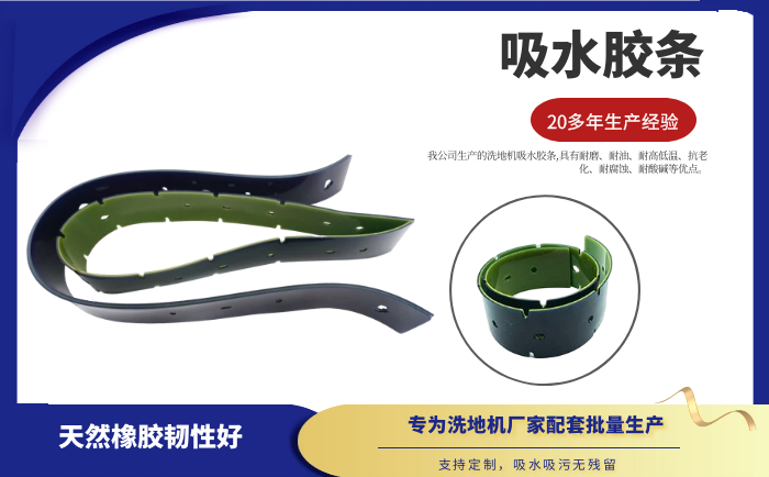 產品說明:吸水膠條是洗地機吸水扒上的重要部件,作用就是與地面接觸,產生一個密封的空間,把地面上的污水通過風機進行回收。吸水膠條一般分為耐油型(進口PU原料)和普通型(進口NR原料)兩種。